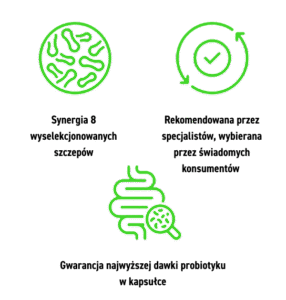 8 wyselekcjonowanych szczepów bakterii probiotycznych w ściśle dobranych proporcjach, pozostających ze sobą w synergii